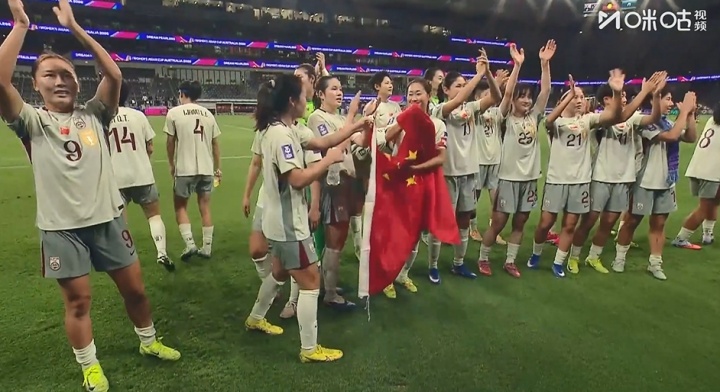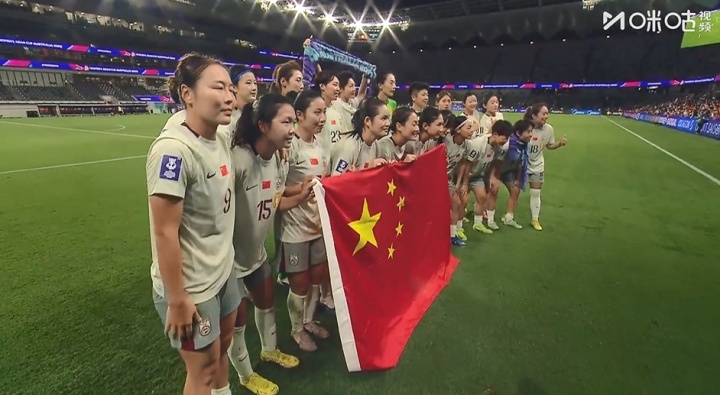 比赛结束后,中国女足球员们场边谢场,举国旗合影,并感谢球迷支持。