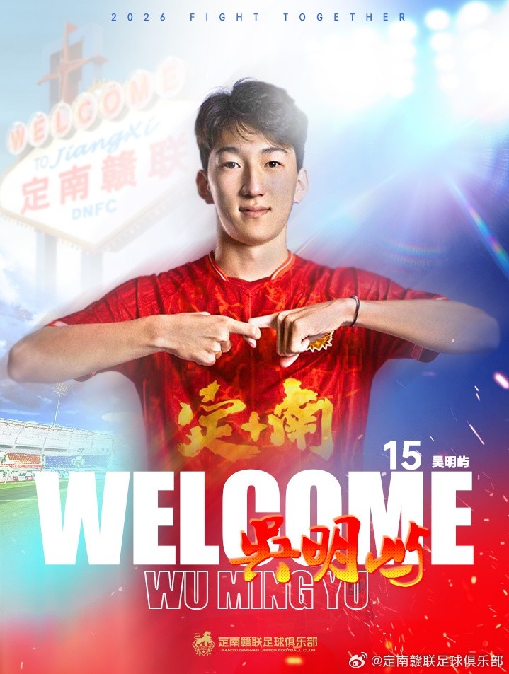 2026赛季吴明屿租借加盟定南赣联。他将身穿15号球衣代表定南赣联参加中甲联赛,欢迎吴明屿加入定南赣联足球俱乐部。